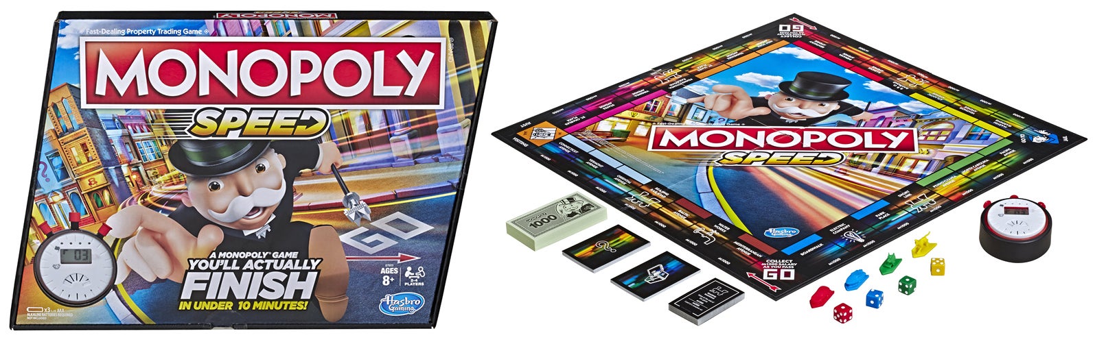 Hate Monopoly? The next time visiting friends suggest playing the popular board game, you can whip out the new Monopoly Speed version (available December 1 for $20) which promises to be over in less than ten minutes. Every player gets their own dice and rolls and buys properties all at the same time through four rounds where everyone is competing to snap up, sell, and trade properties while an included timer counts down. Getting out of jail is completely free, and two Go spaces ensure financial ruin is impossible. The goal here is to become filthy rich faster than everyone else does.