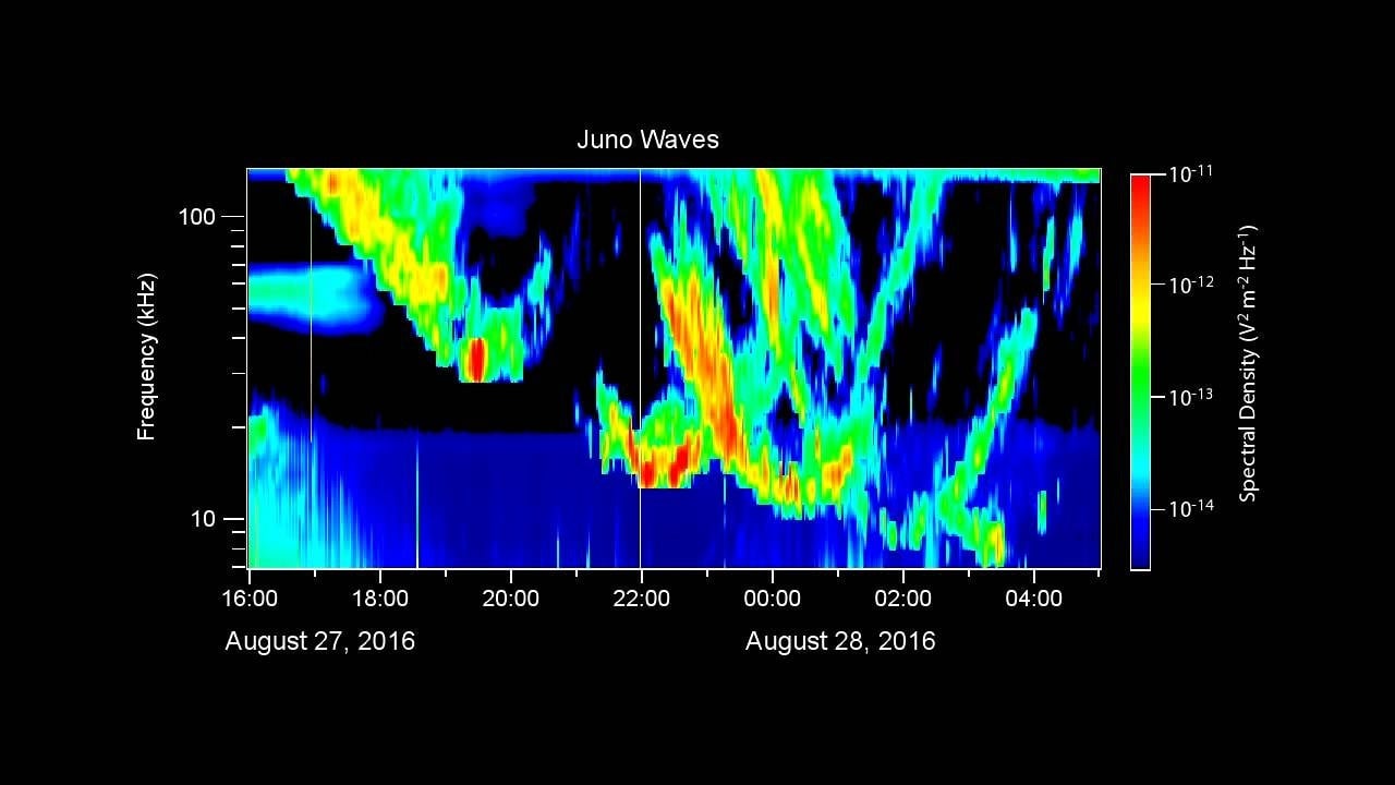 Among the biggest surprises so far, the north pole appears to lack the striated belts and bands of clouds that are so prominent at Jupiter’s mid-latitudes. Instead, the image above reveals a churning swarm of cyclones, like ethereal blue galaxies all clamoring for space. Juno’s first flyby also captured the fiery beauty of Jupiter’s southern lights, which are barely visible from Earth, along with some auroral radio emissions which are straight nightmare fuel pitched up: