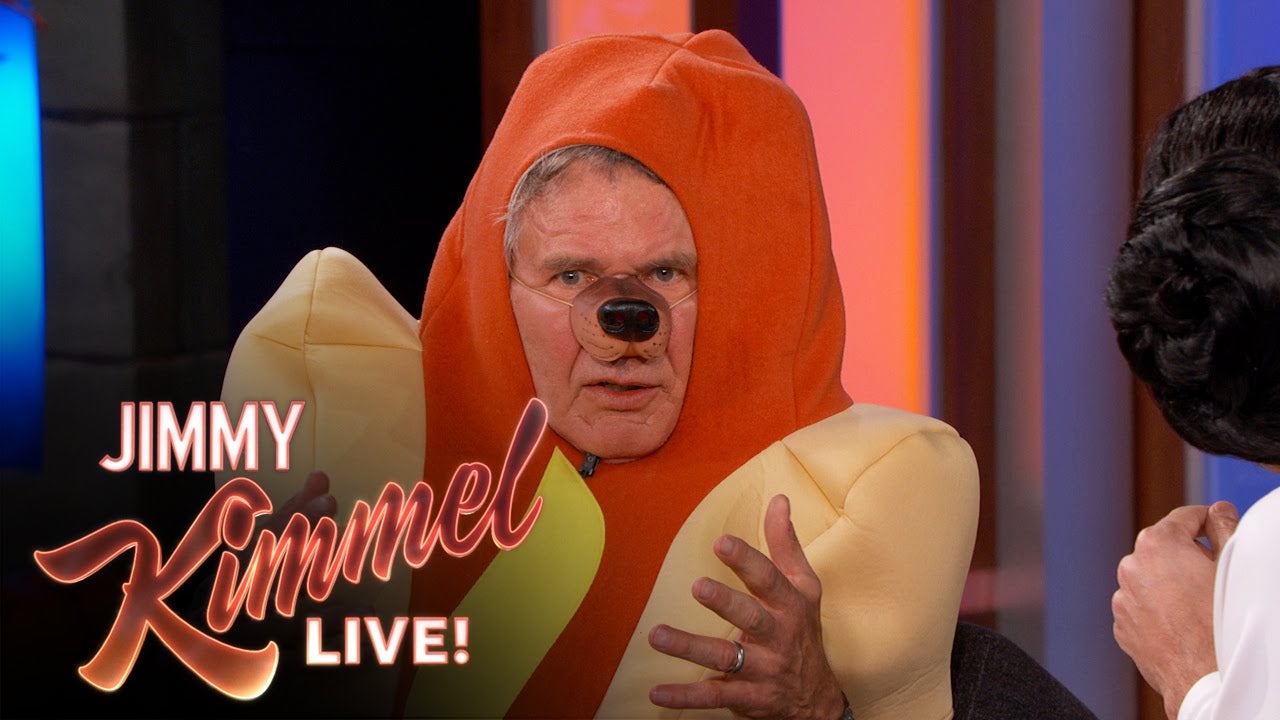 A surprisingly game Harrison Ford stopped by Jimmy Kimmel Live to discuss Star Wars and the upcoming new installment. Notably, he was in a cheap hot dog Halloween costume at the time, because sometimes life truly is worth living.