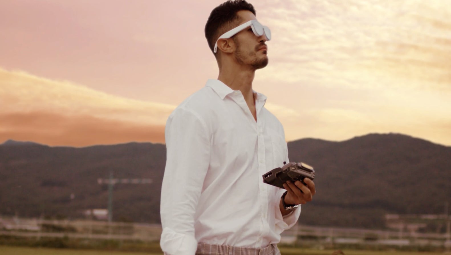 In the first “Glasses Lite” video, you can see a man wearing what appears to be a chunky pair of white sunglasses with a square-shaped embedded screen. The glasses would be capable of letting users watch movies, participate in video chats, fly drones, and project a holographic display for getting work done, according to the video. There’s also a section where it appears you can control the glasses via a Samsung Galaxy Watch. Another neat tidbit is that the Glasses Lite look like they come with a sunglasses mode for when you’re outside. That’s crucial, as many consumer-grade AR glasses have yet to solve the problem of ambient light washing out the projected display.