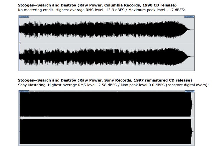 My favorite illustration of the loudness wars comes straight from the Chicago Mastering Service’s explainer on loudness (by far the most concise and clear explainer, which I refer to throughout and you should check out.) The engineers at CMS compare the recordings of a 1990 CD release of The Stooges’ 1973 classic Raw Power and the 1997 remaster of the same record.