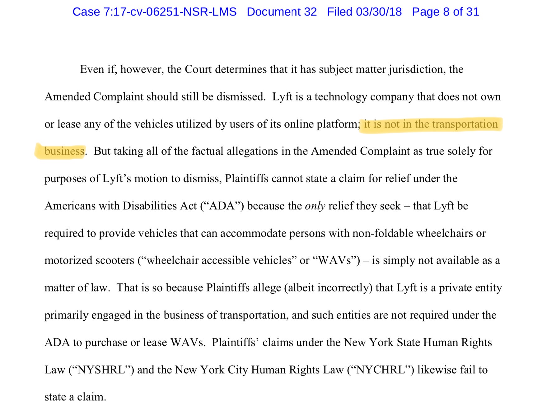In response to multiple discrimination lawsuits, Lyft argued that “it is not in the transportation business” and therefore should not be troubled by the Americans with Disabilities Act (ADA). Instead, Lyft argues, it is a technology company.