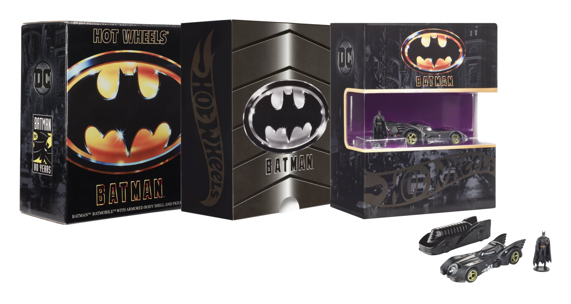 First up is Hot Wheels’ diecast car of the Armored Batmobile from the Tim Burton Batman movie, which turns 30 this year. As well as a fully detailed replica of the ‘89 Batmobile itself, the special set also comes with a small diecast figure of Michael Keaton’s Batman, but also a special protective shell replicating the film’s armored upgrade for the vehicle. Simply pop it over the Batmobile and your Hot Wheels car is protected from the deadliest threats a small toy car could ever face! So like, falling off a shelf, probably, if you take it out of the fancy Batman ‘89-themed packaging. If you’re at the con, this set will cost you $25.