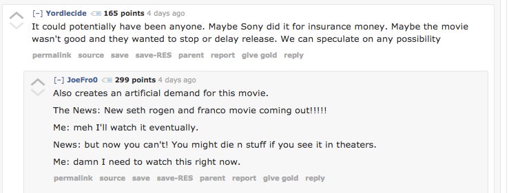 CALLED IT! @patrickdijusto What If focus groups tell Sony "The Interview" will flop. Sony cooks up elaborate ruse to justify shelving it.