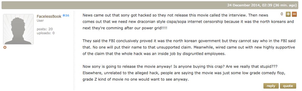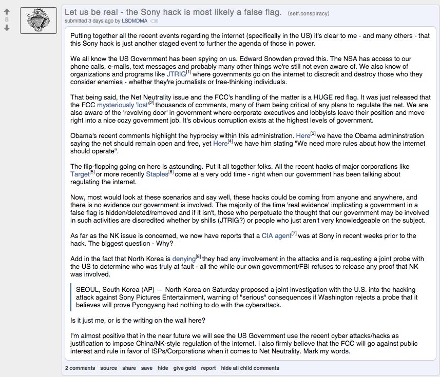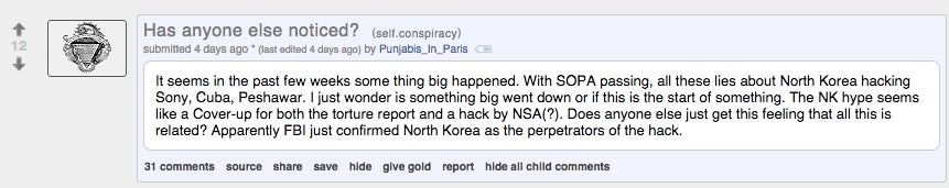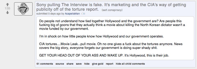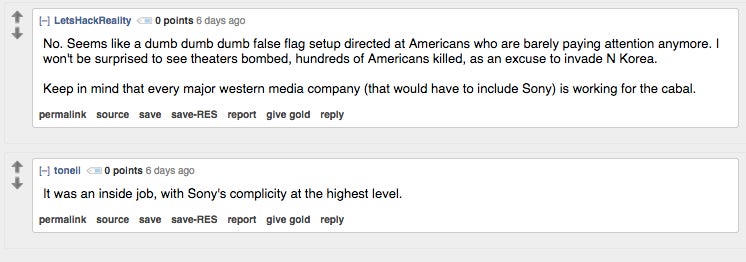 The Sony hack is a terrible, awful thing that’s going to leave thousands of everyday employees dealing with the repercussions for years to come. But! At least there’s a crazy, ranting, sheeple-slaying silver lining. Friends, allow us to introduce you to the Sony hack truthers. There are a lot of them.