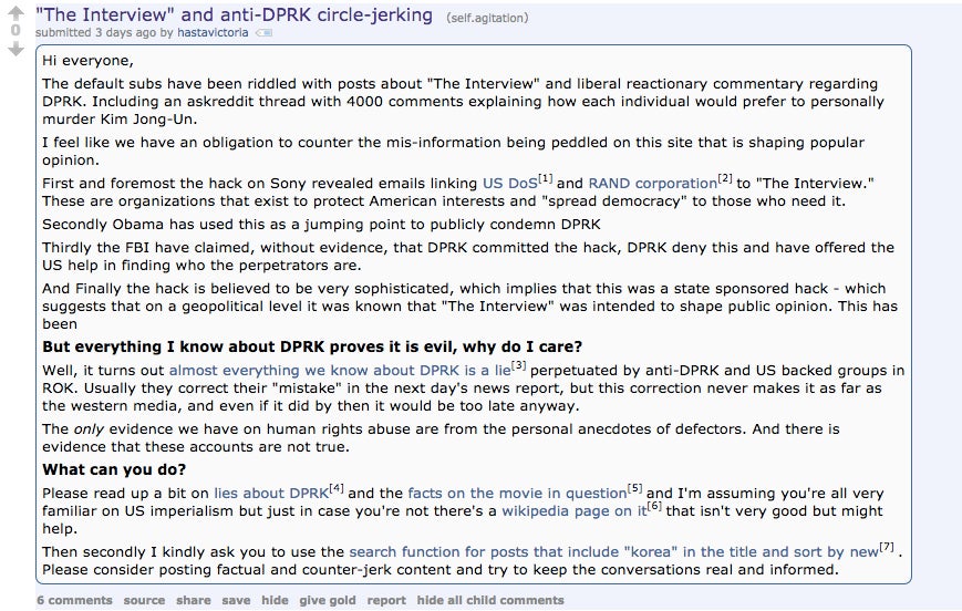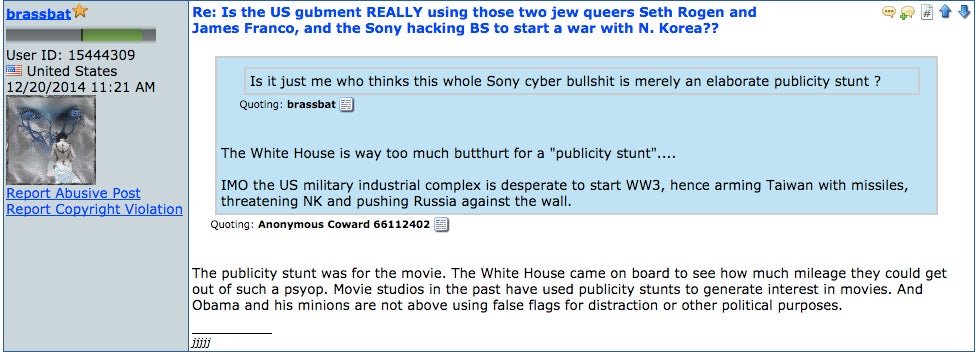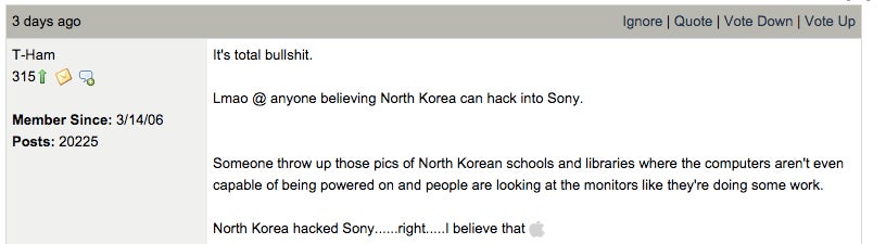 North Korea didn't hack Sony. It's a false flag to sell internet tryanny laws & a marketing ploy. Only low IQs will watch The Interview