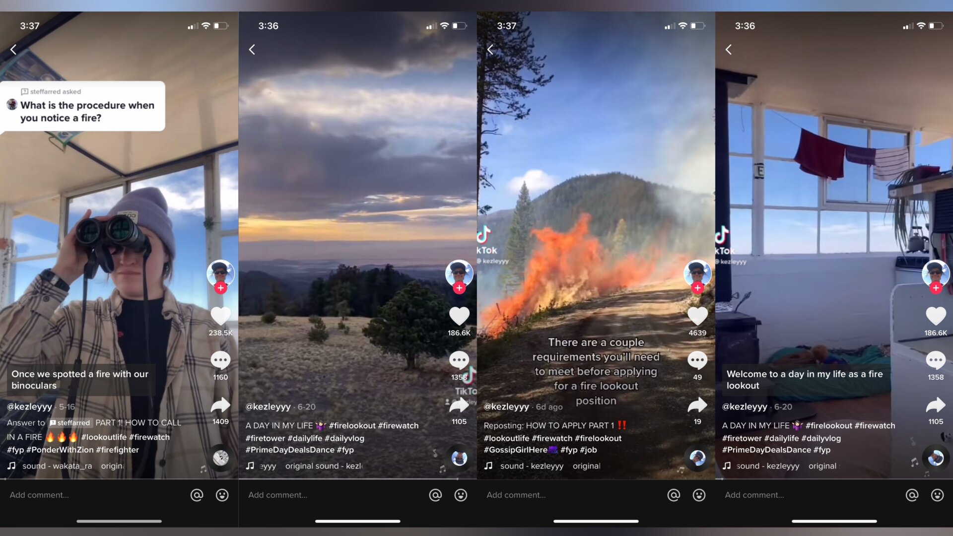 Sims, 26, posts regular dispatches from her job as a fire lookout working for the Forest Service on top of a mountain in New Mexico, where she scans the horizon each day for signs of wildfires. She’s amassed more than 132,000 followers, and it’s not surprising—her account is uniquely addicting. Her posts include footage of stunning 360-degree views of sunsets from the tower, foggy forests, and beautiful wildflowers, combined with unique insights into a job most Americans might not even know exists in the modern age. Sims also has a dynamic personality, which has also contributed to keeping me hooked.