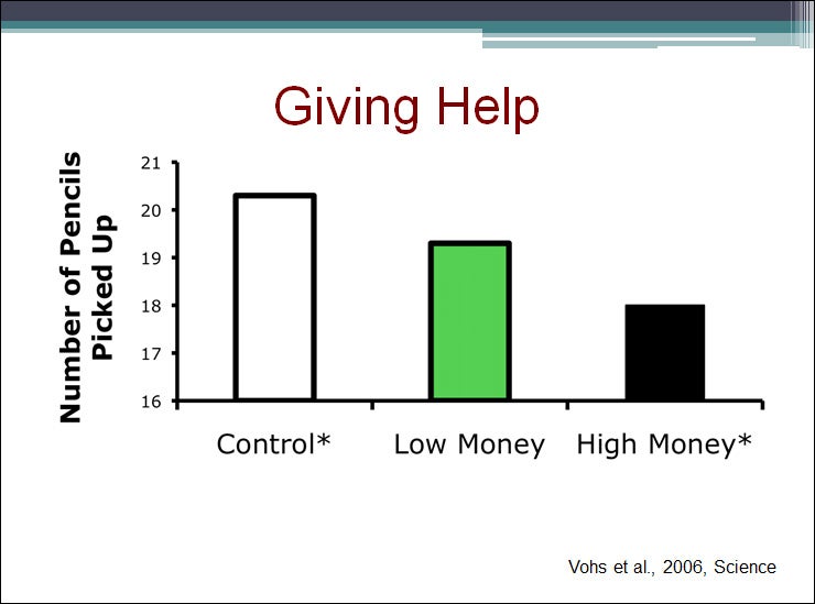 In the experiment, volunteers were exposed to varying amounts of money. Afterwards, another lab confederate carrying a bundle of pencils deliberately bumped into them and dropped the pencils in order to see how helpfully the subjects would respond to this “accident.” Volunteers who were exposed to no money — the control group — were more helpful than those who had been exposed to a low amount. The low-amount subjects, in turn, were more helpful than those in the high-amount group.