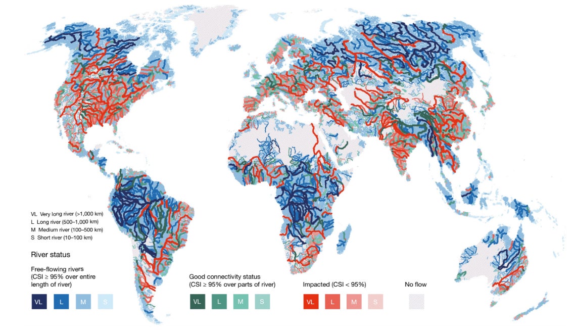 There, the results are much more stark. Sixty three percent of very long rivers—those 620 miles or more in length—are no longer free flowing, blocked up by many of the estimated 2.8 million dams globally. Of the 37 percent of mega rivers that remain free-flowing, most are in the Arctic, Amazon, Congo, all areas that are hard to develop and lightly populated.
