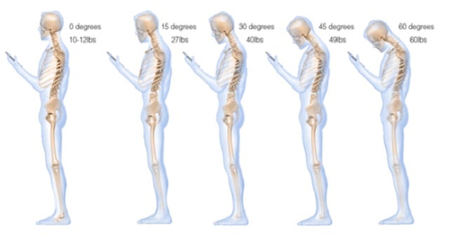 Someone should. A cursory search for “occipital neuralgia smartphones” will bring up a recent report from the Sioux City Journal that warns of the strain our handheld devices put on our necks. One journal article cited in the article explains how tilting your head forward 60 degrees puts an extra 60 pounds of pressure on the top of your spine and surrounding muscles. This, unsurprisingly, can lead to pain: