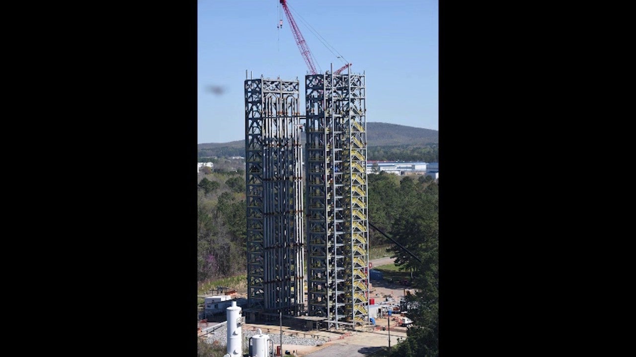 Construction on test stand 4693 began in May 2014 and finished in December 2016. The structure stands 221 feet (67 meters) tall, and is located at NASA’s Marshall Space Flight Center in Huntsville, Alabama. To commemorate the end of the major construction phase, NASA released a 60-second timelapse showing the platform as it was being built.