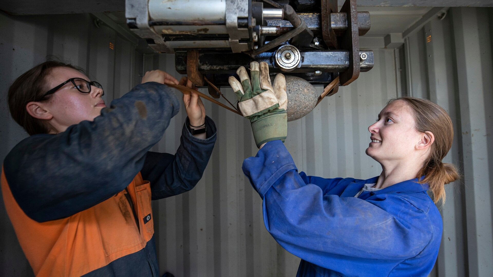It turned out to be easier (if a bit less recklessly fun) to get two shipping containers, cut a hole in the floors and roofs of them both, stick roof targets at the bottom and position a downward-facing cannon at the top. A bona fide volcanic block—anywhere from 2 to 20 pounds—is attached to a rod stuck to a piston inside the cannon. The cannon is pressurized, a trigger is pulled, and the sudden decompression propels the rock toward the roof at over 100 miles per hour.