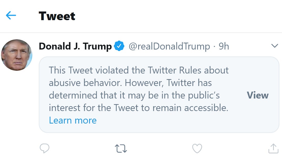 Twitter has broken with its yearslong policy of giving Trump total impunity to tweet whatever he wants without the site taking any action. Last month, it attached a fact-checking notice to a Trump tweet asserting a nationwide voter fraud conspiracy. It also hid from his timeline a dog-whistling tweet in which the president threatened to send the military to shoot protesters, explaining it violated rules against “glorifying violence.” The latest removal is similar, except this time Twitter states the broken rule was against “abusive behavior.”