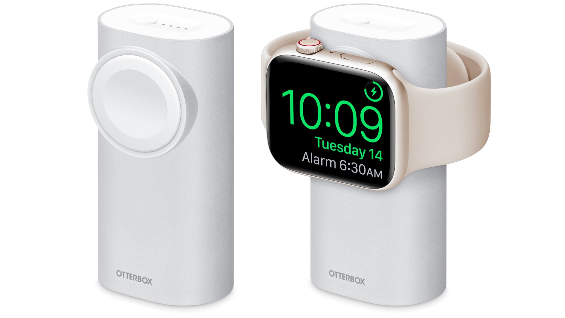 Otterbox’s new 2-in-1 Power Bank is yet another device that can be used to charge the Apple Watch should you find yourself without access to a power outlet before it dies, but with a more useful design than other solutions we’ve seen. It features a magnetic charging mount for the Apple Watch, and with the power bank standing on its end, it can turn the wearable into a bedside alarm clock, using watchOS’ Nightstand Mode for the effect.
