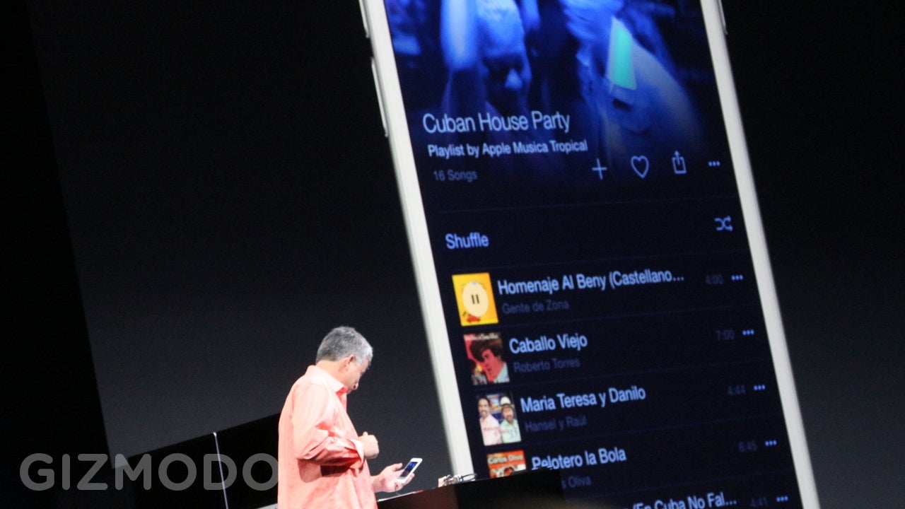 Knee deep in an Apple Music demo. It looks like an app. Big bold cover art and photos of the bands and artists feature prominently here. Eddy Cue decides to hold an impromptu Cuban house party.