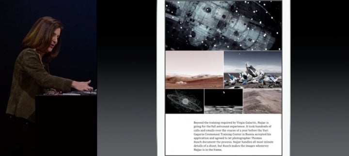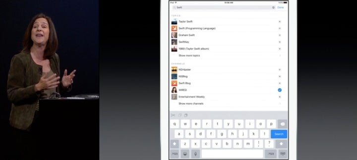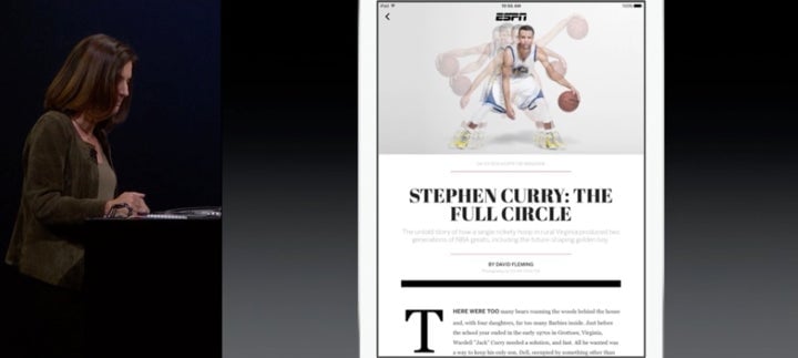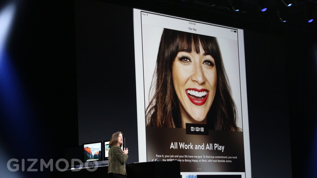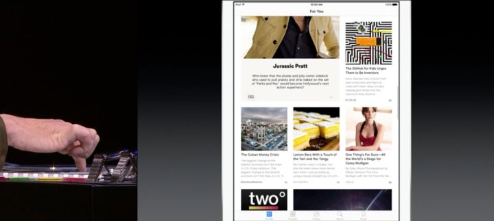 Brand new app: News. “We think this offers the best mobile reading experience ever.” It automatically pulls in news articles from some of your favorite sites and makes them reasonably pretty—much like Flipboard—but Apple’s also apparently letting news orgs build native content for Apple News too, complete with animations that play as you scroll down the page. Embedded video too.