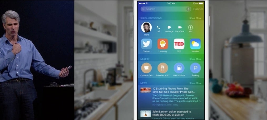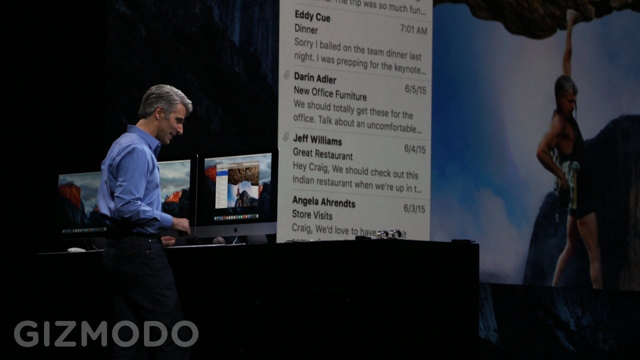 Here’s a jab at Google Photos—which stole the show at Google I/O—too: Craig can say “Show me my karaoke photos of Eddy,” and up they pop. Siri knows what “karaoke” photos are, and that “Eddy” is Eddy Cue.