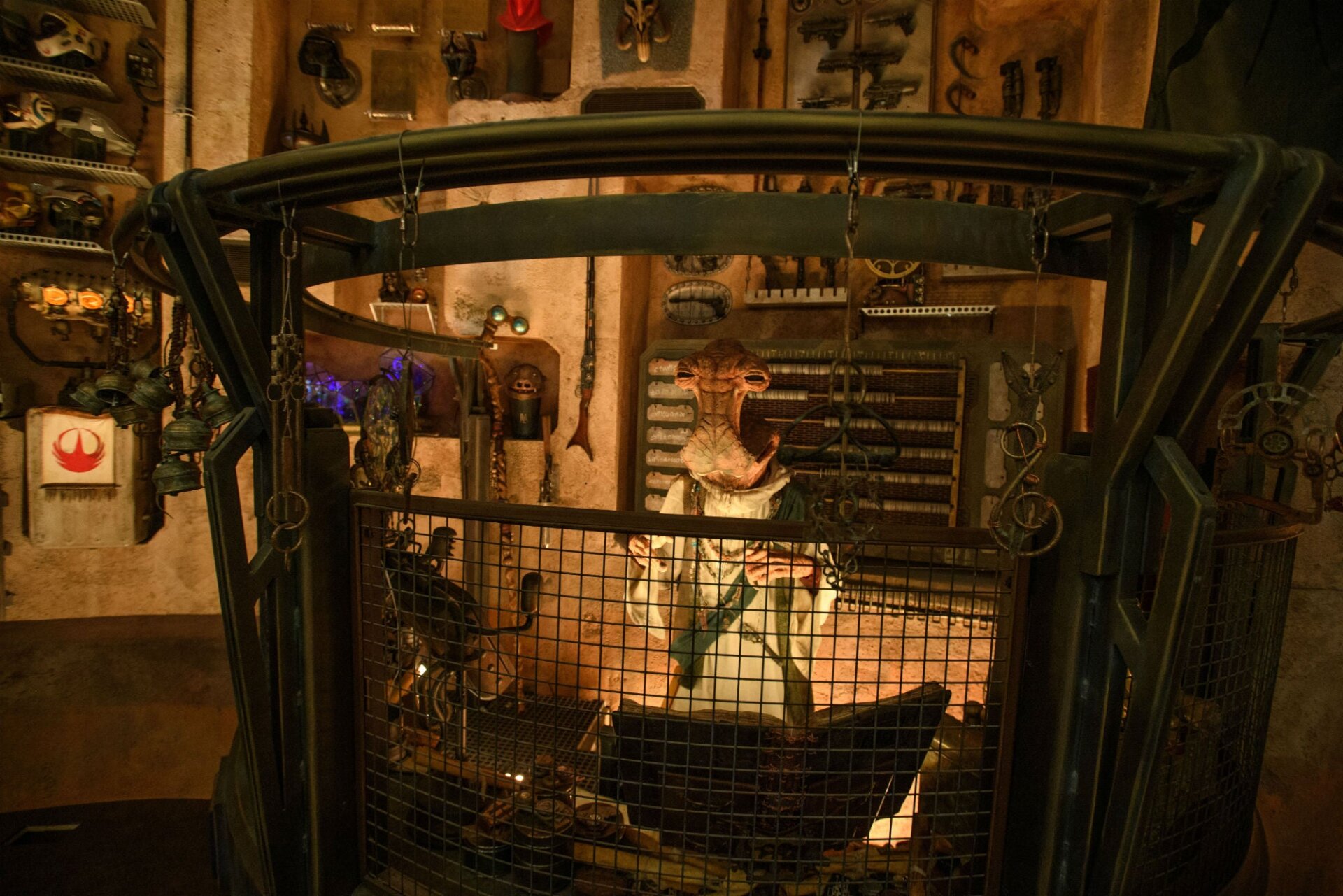 If Galaxy’s Edge is filled with Easter eggs, Dok-Ondar’s Den of Antiquities is the Easter bunny. It’s a store, first and foremost, that sells some of the coolest Star Wars merch ever: lightsabers, holocrons, prop replicas. But it is also filled, top to bottom, with things to gawk at. The aforementioned Indiana Jones reference is in here, as is a look at what a baby Sarlacc looks like. Heads of famous creatures are on the wall. A full-size stuffed Wampa! There are references to Rebels and Clone Wars, and this is the only place you’ll find blasters in Galaxy’s Edge. Basically, this is a can’t-miss stop, even more so for sightseeing than shopping. Plan accordingly.