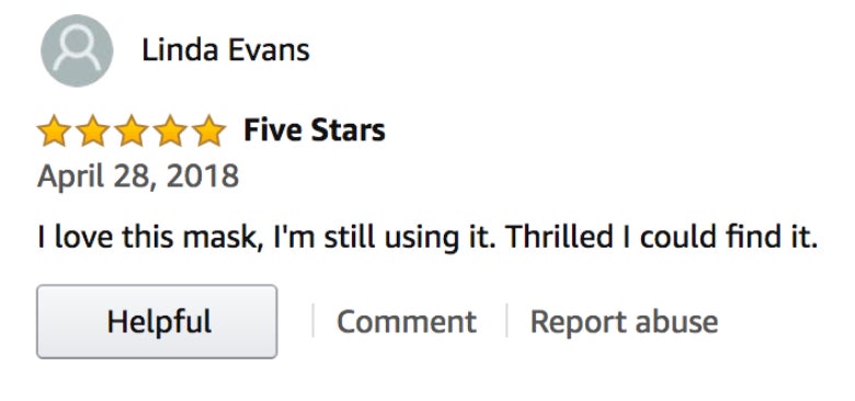 Upon request, Evans’s management team confirmed that the review is authentic, that the masks were discontinued for reasons she doesn’t remember, but “she does use it and it works remarkably well for her.”