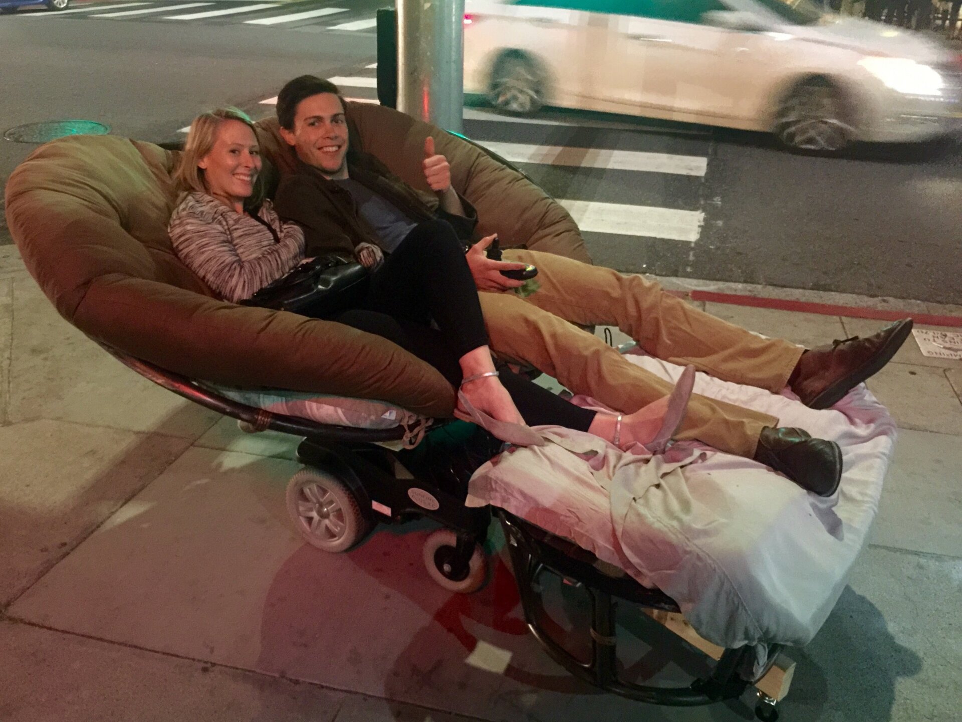 Multiple photos and videos have surfaced of the motorized chair and its passengers, a young, freewheeling couple who are apparently all too happy to indulge the papasan paparazzi.