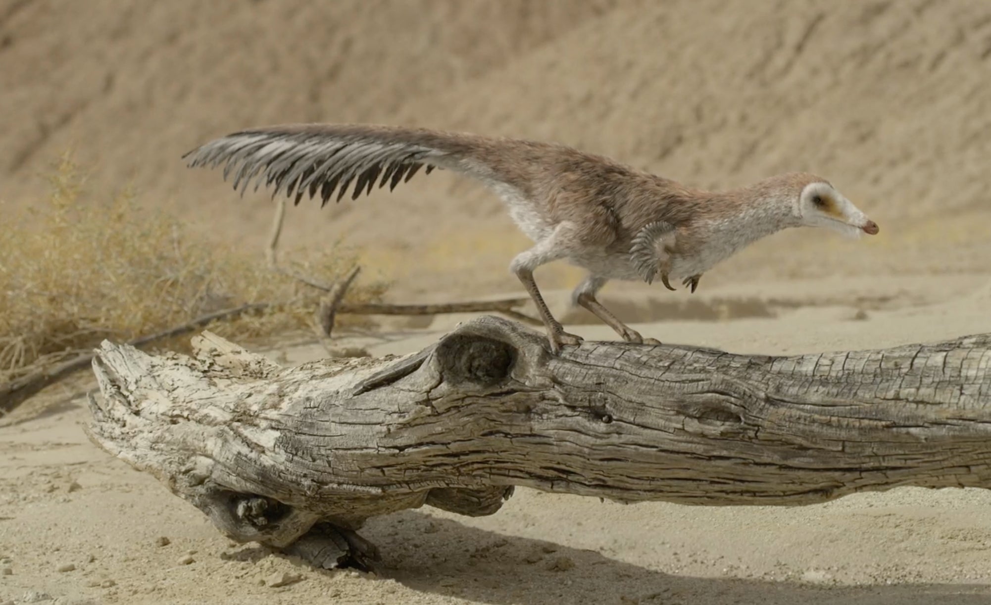 This exclusive footage is from the episode on deserts, and features a Mononykus on the hunt. In the clip, the roughly dachshund-sized dinosaur inspects a withered log in a desert, before rapping on the wood using a claw on one of its stubby forelimbs. Then the dinosaur pokes a hole in the log, and slurps up termites with its prodigious tongue. This depiction is in line with one theory about Mononykus’ ecological niche: that the dinosaur hunted like modern-day anteaters and pangolins.