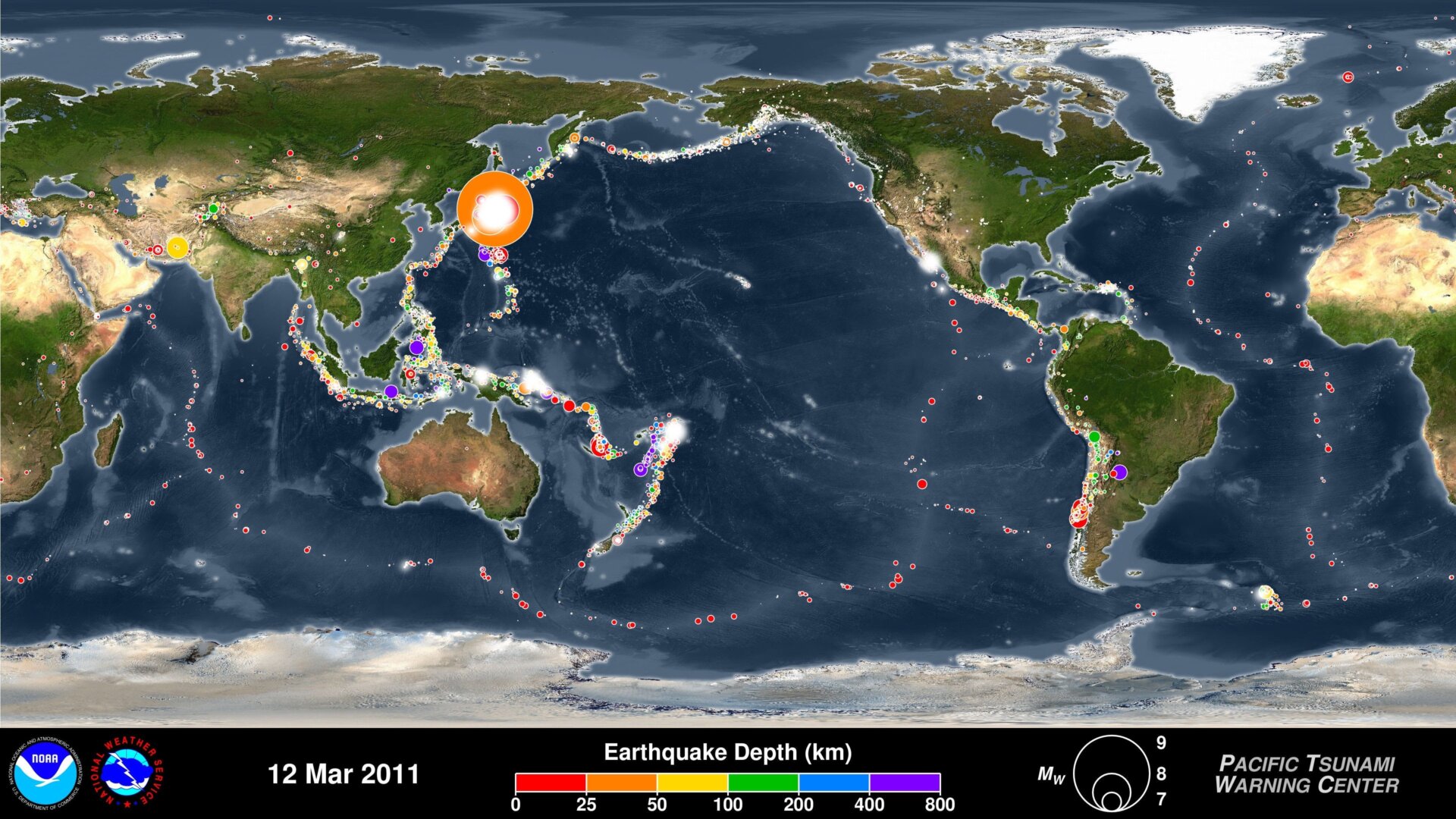 A few weeks ago, the US National Weather Service’s Pacific Tsunami Warning Center (PTWC) released this soothing and terrifying animation of every earthquake it recorded from January 1, 2001 to December 31, 2015. Here’s my suggested backing track, and here’s how the video’s description says to read the map:
