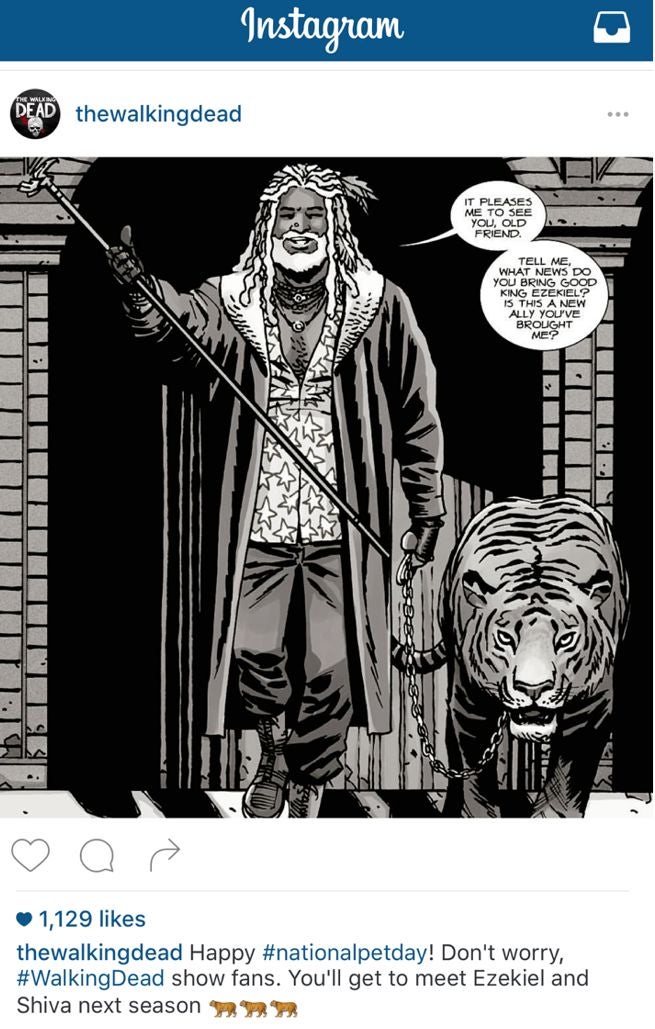 Speaking of social media mishaps, celebrating National Pet Day on social media yesterday, the Walking Dead’s official twitter account shared an image from the comics of Ezekiel, leader of a survivor enclave known as The Kingdom, and his pet tiger Shiva, saying that the two would appear in the show’s seventh season: