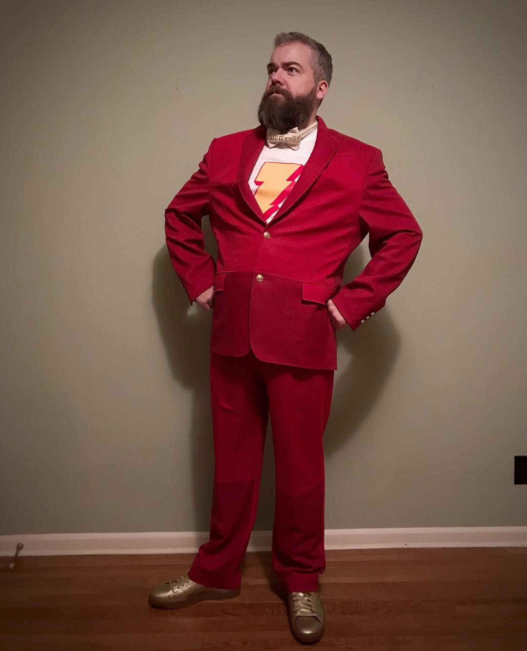 Celebrating the premiere of Shazam, Sandberg took to his Instagram to post a picture of himself in a special suit, one created by the movie’s costume department entirely out of the same material used to create Zachary Levi’s Shazam suit.