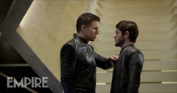 Empire also has this photo of Black Bolt squaring off with Maximus. While it may not look like much at first glance, note the V-shaped archway behind Bolt serving as a visual signifier of the character’s famous forked antennae as he physically presses up against his runtier, evil brother. Likewise, Maximus is rendered by the backdrop of a white stairwell — it’s frilliness denoting the villain’s love of fancy collars. Semiotics!
