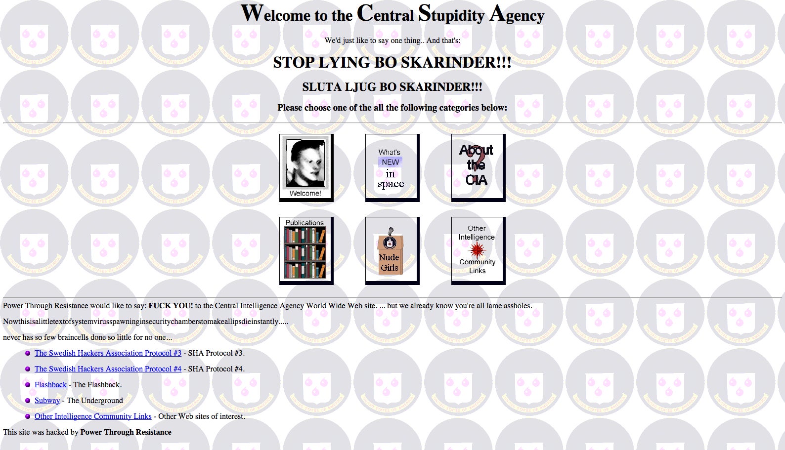 Power Through Resistance would like to say: FUCK YOU! to the Central Intelligence Agency World Wide Web site. … but we already know you’re all lame assholes.
