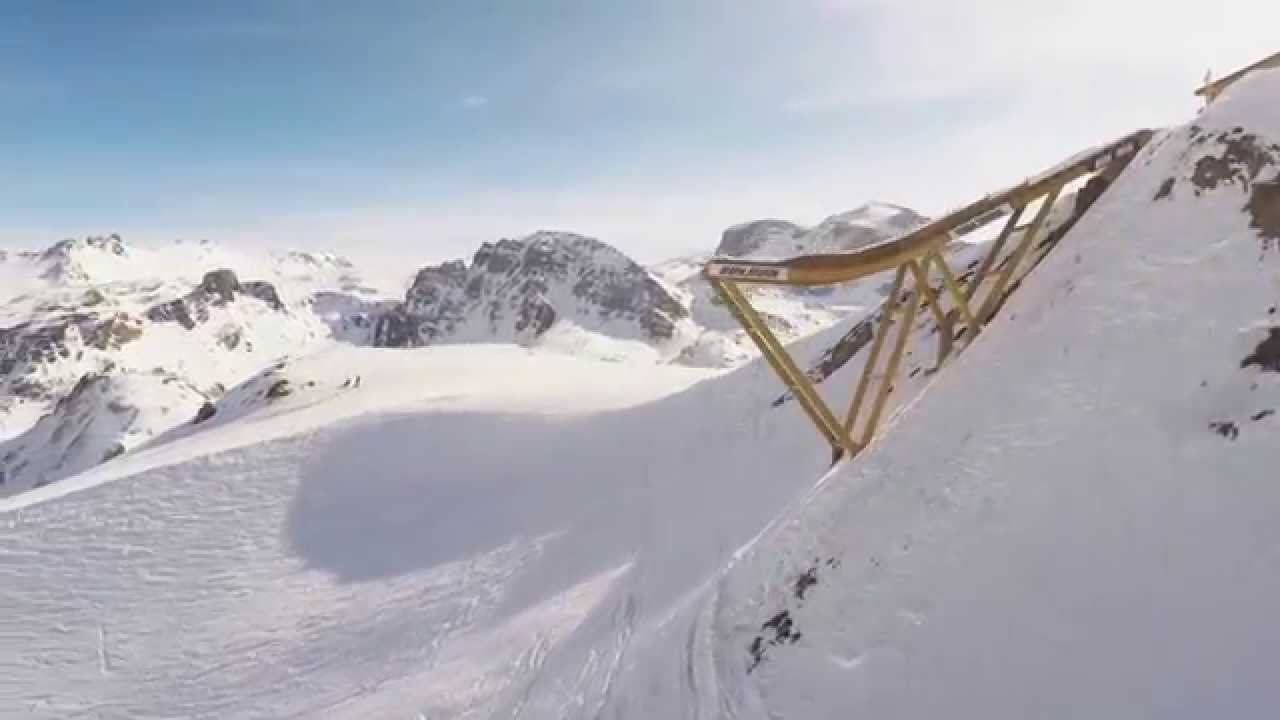 Bun J Ride is an activity in Tignes ski resort in the French Alps. For $75, willing victims can ride skis, snowboards, or even tandem sleds down a ski jump. They’re attached by two bungee cords to ziplines on either side, which reduces the risk of penduluming around like a lunatic with sharp metal planks attached to your feet.