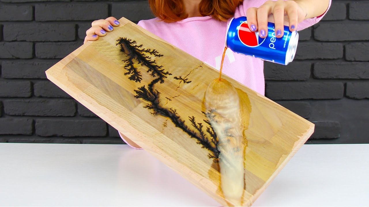The next time you accidentally spill soda, or water, plus a little baking soda on one of your cutting boards, don’t complain about having to clean it up. Instead, tear the safety cover off your microwave and use it as a high-voltage power source to etch a cool lightning pattern into the mess.