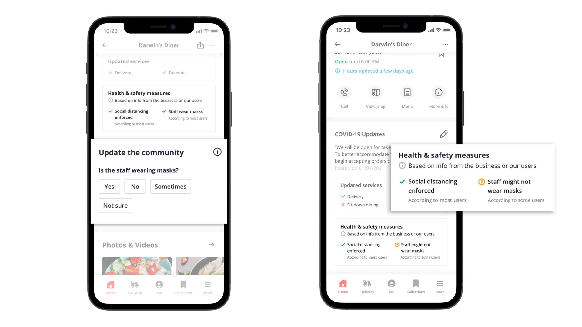 Yelp announced the change today in a press release noting that “several user responses” from logged-in Yelpers are needed for a business to suffer an orange question mark, connoting that either “social distancing might not be enforced according to most users” and/or “staff might not wear masks according to most users.” (Truly egregious offenders might get both orange marks of shame.) Conversely,if enough customers congratulate a restaurant for doing well, the business can get up to two green checks stating: “Social distancing enforced according to most users” and/or “staff wears masks according to most users.”