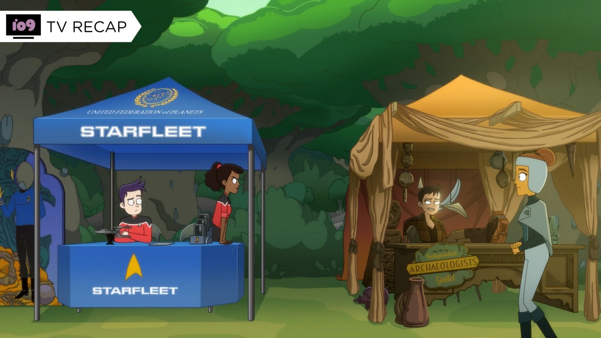 Let’s dive into the A-plot a bit more. Mariner is consigned to the recruitment booth by Ransom as part of his ongoing management of her performance, and the key struggle here is that she has to balance doing her job—pitching Starfleet to the locals as an exciting adventure—while the nearby Petra, from her own archaeologist guild booth, expertly skewers all those promises. It’s the sort of deeply nerdy humor that Lower Decks is at its best with: not necessarily loving pastiche of Star Trek, but the questions we all constantly think about its world. In this case, it’s primarily if whether or not Starfleet is the exploratory scientific organization it pitches itself to people as, or if it’s really the quasi-military that… well, that it really is. Can Starfleet really be about discovering the undiscovered country, as Mariner is forced to bleat, if most of the time it’s actually about trying not to be assimilated by the Borg, or getting in disputes with the Klingons, or the Romulans, or the Cardassians (a potent reminder that Lower Decks is not *that* far removed from the aftermath of the Dominion War!)? Can a career in Starfleet really promise safety, freedom, and scientific curioisity if it acts and dresses like a military? And just why do they change those damn things every few years?