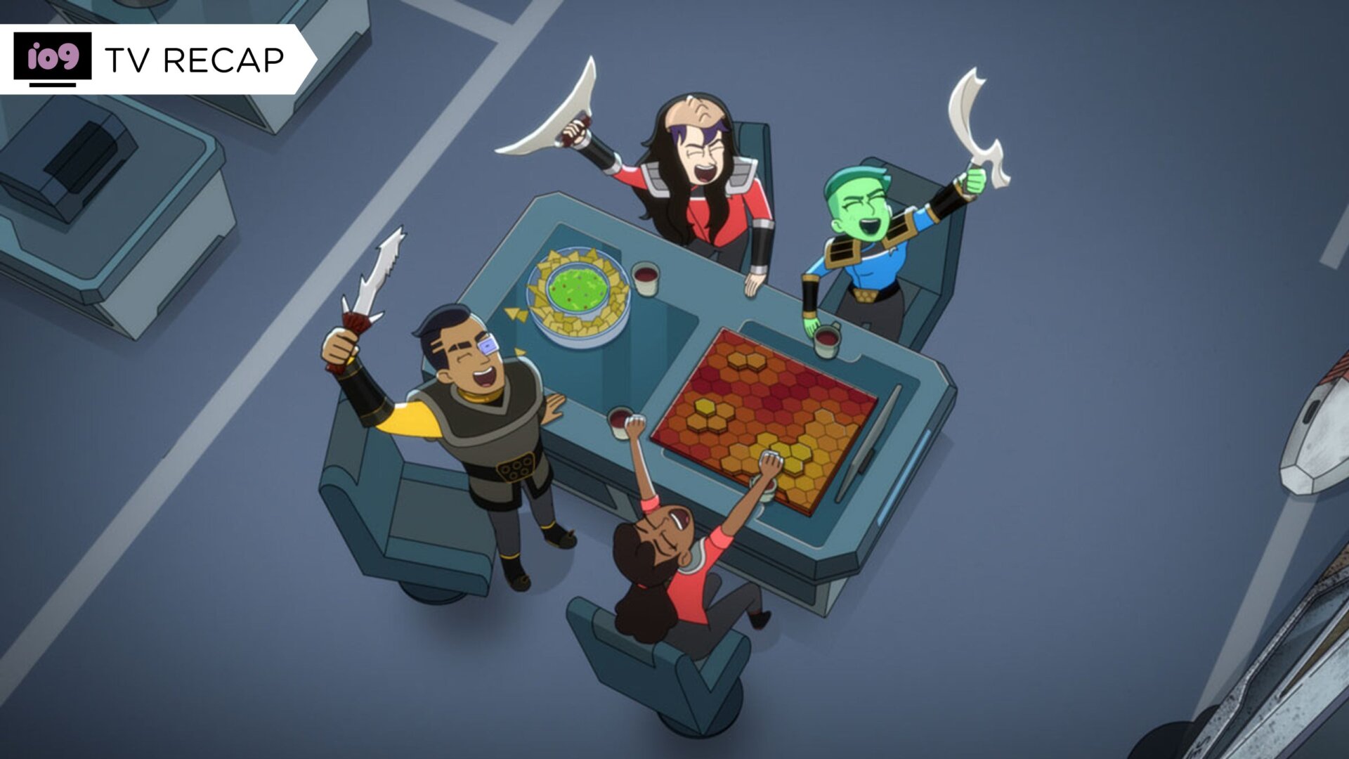 “The Least Dangerous Game” is perhaps a little too Trek-trope burdened for its own good at times. Following the Cerritos as it tries to help out a nearby planet repairing a vital space elevator leaving civilians stranded on and off world alike, the episode feels like even more of a reset than last week’s knocking-down as Commander Ransom takes over Mariner’s “parole” aboard the ship. There’s a lot of funny referential gags going on, of course—from the opening Klingon Dungeons & Dragons knockoff—featuring the lovely return of J.G. Hertzler as Deep Space Nine’s Martok, narrating via PADD screen like those old Star Trek video and FMV games—to a veritable smorgasbord of classic premises: a ritualistic hunter alien aboard the ship! Planet of the pleasure people! A extended riff on Star Trek 2009’s orbital jump!