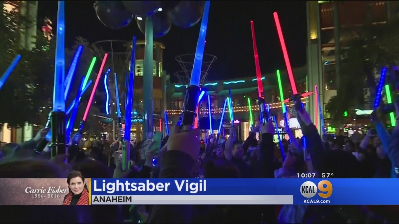 Last night—on the evening of the equally tragic passing of Fisher’s mother, Hollywood legend Debbie Reynolds—hundreds of fans looking to pay tribute to Fisher took to the streets of Downtown Disney in Anaheim, California, raising a legion of glowing toy lightsabers into the sky and towards pictures of Fisher in her most iconic role in lieu of the traditional candlelit vigil.