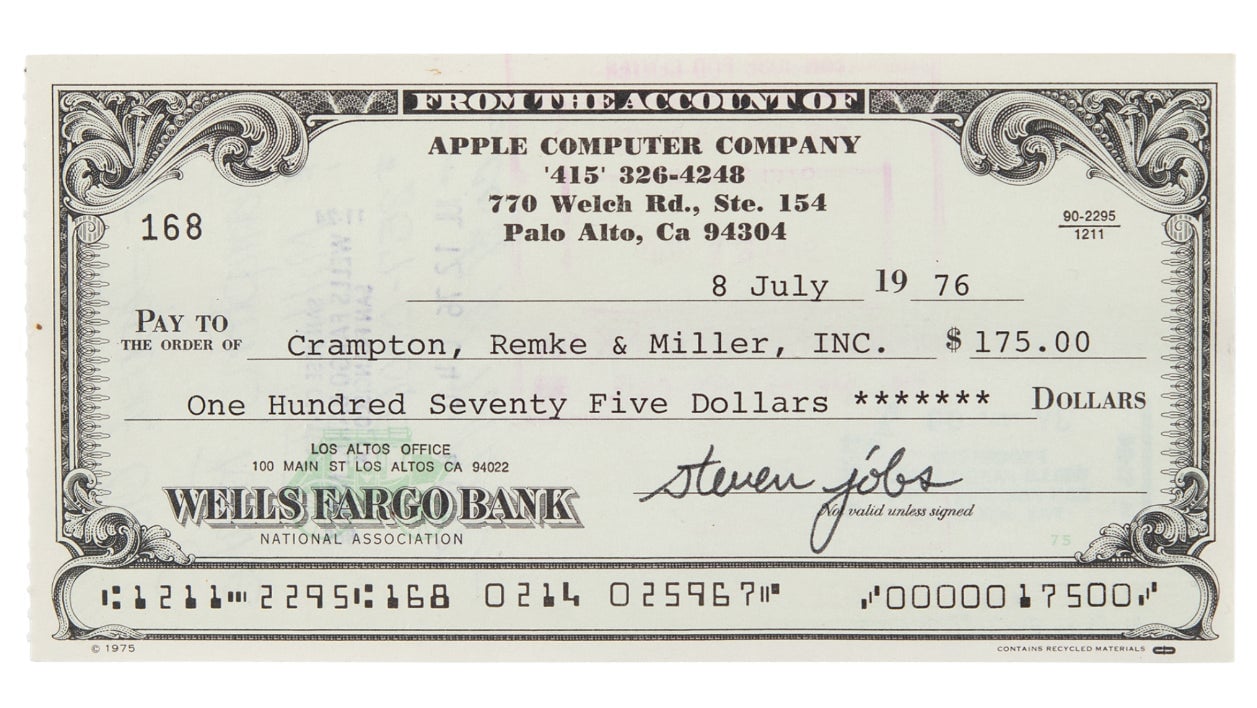 The check went up for auction on April 17 through RR Auction, with bids closing next week, and the current bid is for a whopping $16,500. According to RR Auction’s listing, the Wells Fargo check also has some Apple easter eggs, including the signature of Steve Jobs—written as “steven jobs”—as well as the address 770 Welch Road in Palo Alto which is a mail drop and answering service that the fledgling company used while operating out of Jobs’ garage. RR Auction estimates that the check is worth upwards of $25,000.