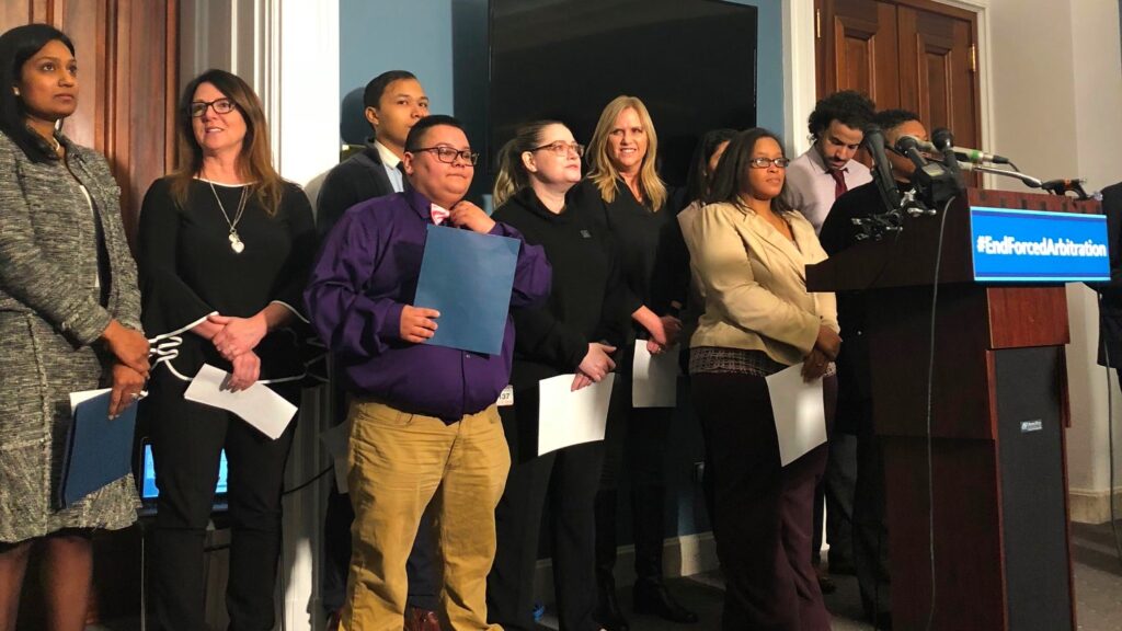 In a bustling room inside the U.S. Capitol on Thursday afternoon, a group of survivors wearing black pins stand behind a podium that reads #EndForcedArbitration. They are all waiting to share their stories—of sexual harassment, of sexual assault, of racial discrimination, of unfair labor practices, of consumer exploitation. The common thread connecting these disjointed individuals…