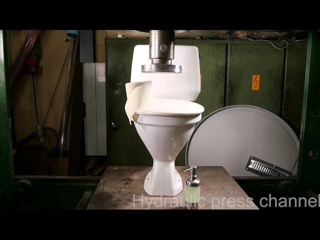 When a hydraulic press takes on the bathroom, things get messy. First, the ceramic toilet completely explodes. Then, the toilet paper is flattened into a useless disk of cardboard. Finally, the soap dispenser dispenses a little bit of soap and cracks in slow-motion before shattering in all directions into a mess of goo and broken…