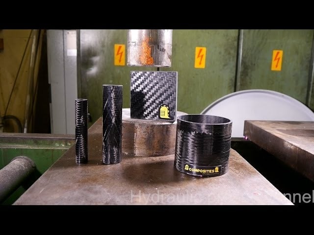 Ever see the super strong, super light super material known as carbon fiber get squished like this? Once the hydraulic press hits it, the threads start coming undone, and it slowly disintegrates as the pressure becomes stronger and stronger. What’s pretty neat, though, is how the carbon fiber rod still stands up steady throughout and…