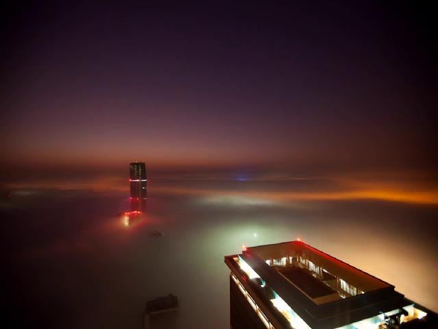 Dubai-based photographer Gerald Donovan has sent us this spectacular video of the city completely engulfed by fog. It’s extremely beautiful and eerie, with the Burj Khalifa and the rest of the buildings completely detached from the ground, apparently built on clouds.