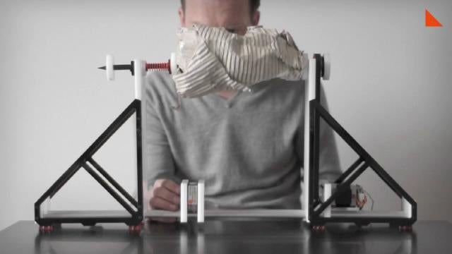 It looks like the kind of spit you’d roast a pig on for some sort of tropical luau cookout. Except instead of flames, there is a supersensitive laser rangefinder. And rather than a suckling pig sizzling, there is a clown head seemingly singing. Or a roll of paper towels. Really, just about any earthly object…