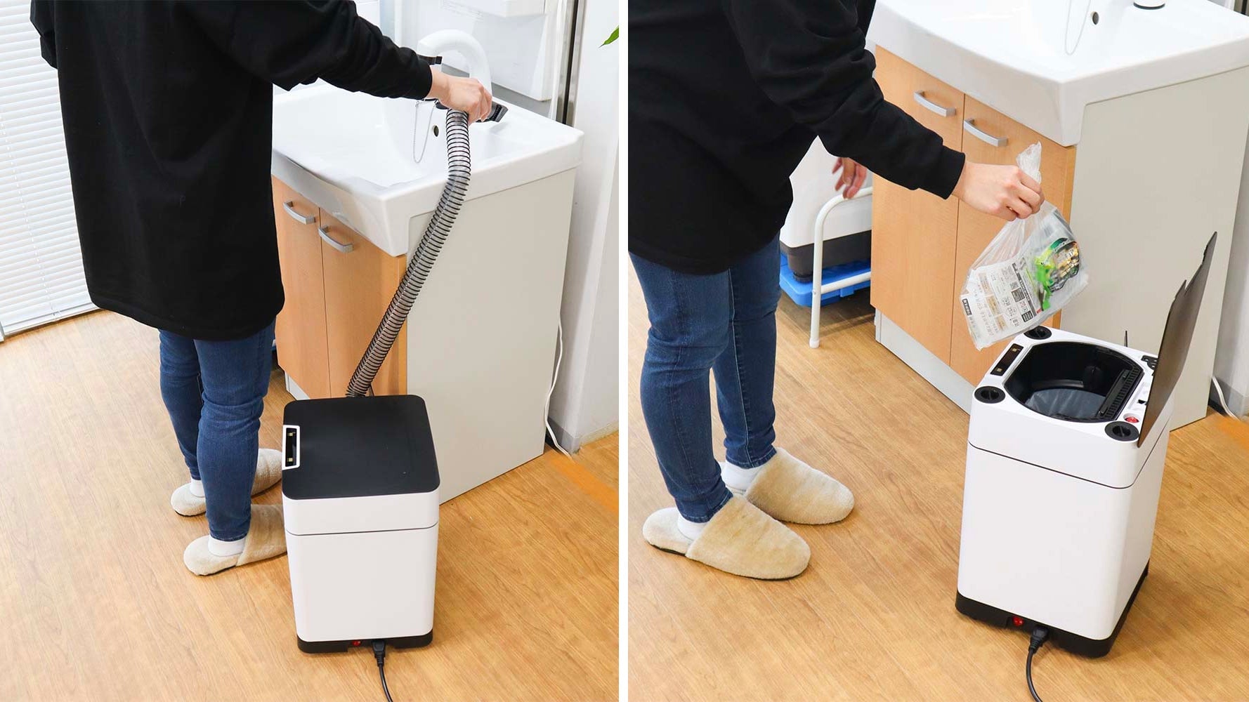 With the lid open, the trash can reveals its extra functionality with slots for storing cleaning tools like flexible hoses and extendable tubes that when connected, along with a power cord, turn the rubbish bin into a full-fledged vacuum that deposits all the debris it sucks up right into the plastic bag. Four free-spinning caster wheels on the underside of the bin allow it to be pulled around like a canister vacuum. And while Thanko seems to recommend the device for use in bathrooms as a way to clean up random hair strands without having to actually touch them, it looks just as useful for a kitchen with crumb-covered countertops.