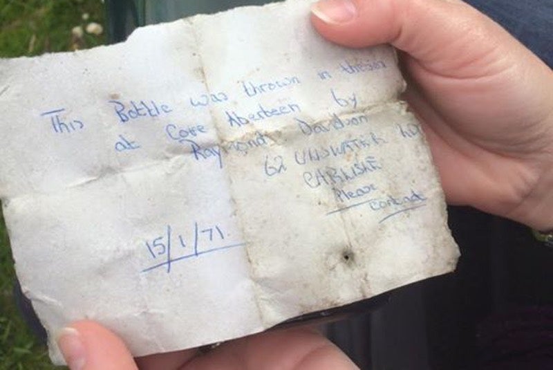 On January 15, 1971 a young boy in Carlisle, England chucked a glass bottle in the North Sea. It contained a note scrawled in blue pen with the boy’s name, the date, and his address. Forty-four years later that bottle was found, washed up in Scotland. And after a bit of internet research, the bottle was returned to its creator.