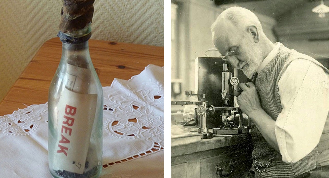 Between 1904 and 1906, George Parker Bidder, a researcher for the UK Marine Biological Association (pictured above) tossed about a thousand bottles into the North Sea. Bidder was studying ocean currents and each bottle contained a note inside promising a small reward (one shilling) for anyone who mailed it back. The note included a survey in English, German and Dutch that would help researchers learn when and where the bottle was found.