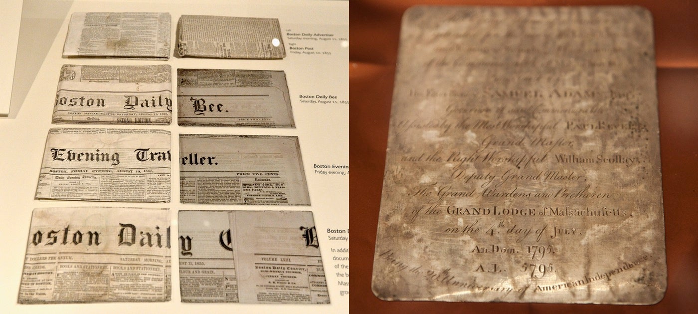 The contents of the capsule now rest in the Museum of Fine Arts in Boston. Newspapers from the cornerstone capsule can be seen below on the left. The silver plaque inscribed by Paul Revere himself is on the right.