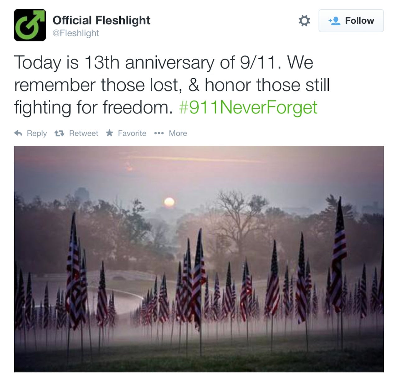 “Today is the 13th anniversary of 9/11,” Fleshlight tweeted. “We remember those lost, & honor those still fighting for freedom. #911NeverForget.”