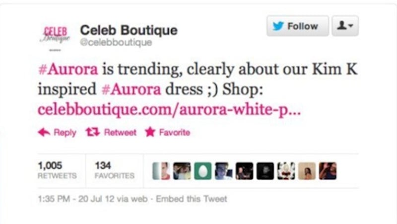 On July 20, 2012, London-based fashion company Celeb Boutique tweeted that Aurora must be trending because of Kim Kardashian’s new dress. But that’s not why Aurora was trending. Aurora was trending because a murderer stormed a movie theater in Aurora, Colorado, killing 12 people and wounding 70.