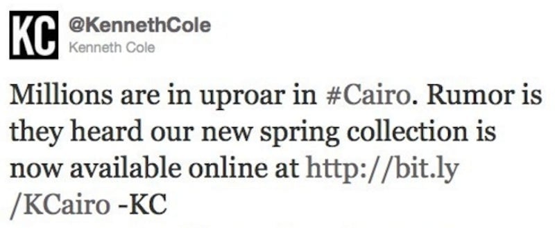 “Millions are in uproar in #Cairo,” the official Kenneth Cole account tweeted. “Rumors they heard our new spring collection is now available online at http://bit.ly/KCairo”