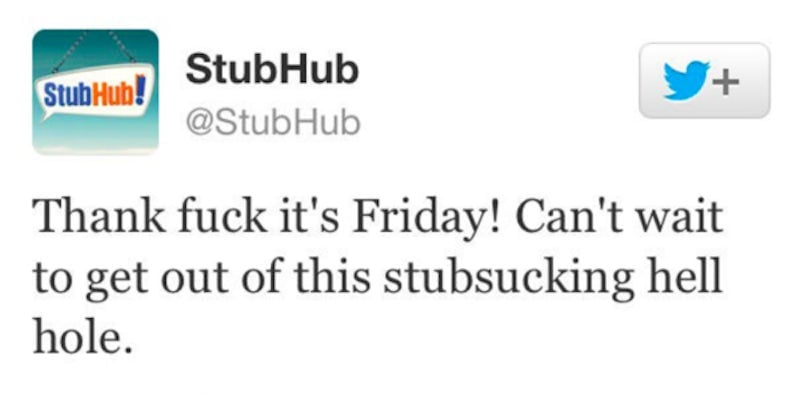 It’s one thing to say you’re happy for the weekend. It’s another thing entirely to invent a brand new word to describe your shitty workplace. And someone with social media access at StubHub did a bit of both back in 2012 when they said “Thank fuck it’s Friday” and described their work environment as a “stubsucking hell hole.”